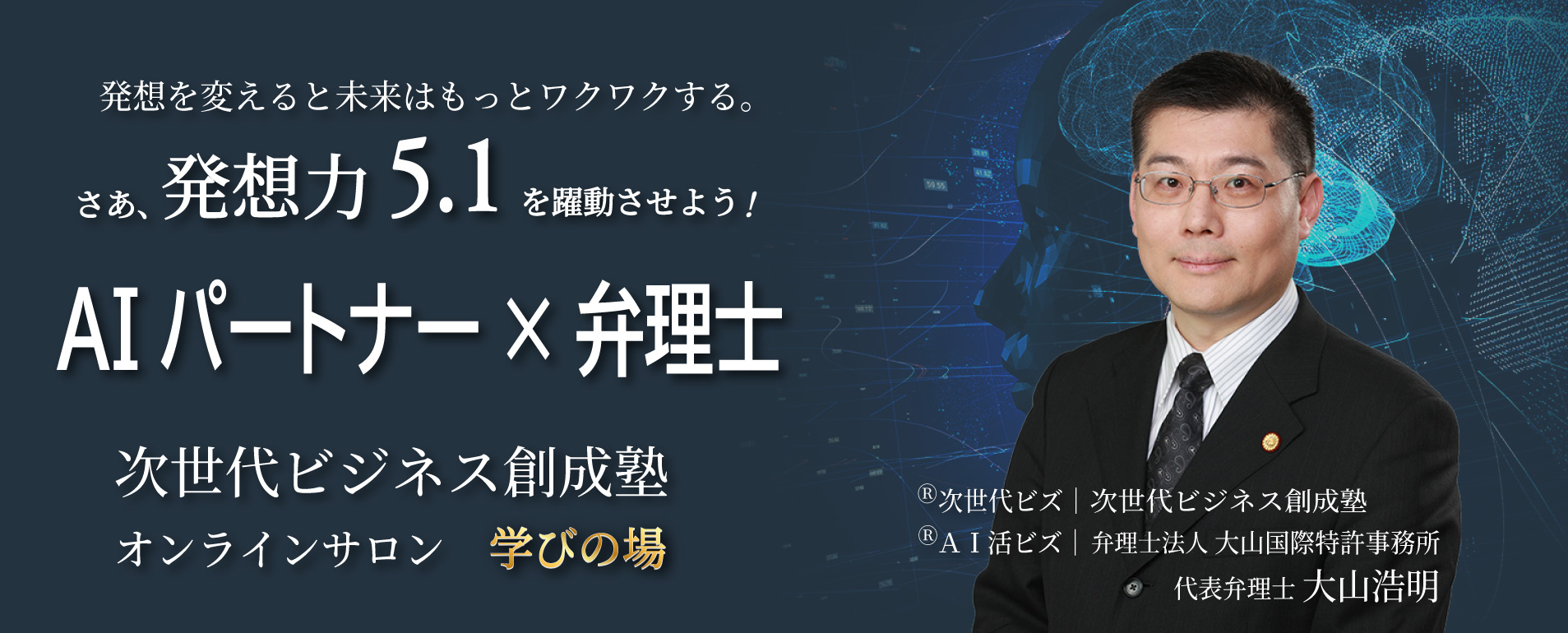 次世代ビジネス創成塾(次世代ビズⓇサロン)運営者・弁理士の大山浩明と申します。 当塾では、弁理士の視点から、実践的AI活用×知財(特許・商標・著作権など)を取り入れながら、進化する発想力・ビジネスモデルなど、いま必要なテーマを「学び」として積み上げています。そして、アイデアを“思いつき”で終わらせず、「カタチ」へ育てることを目指す「学びの場」を提供しています。